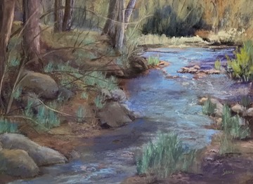 Although quieter and less dramatic than Hoodoo Hillside, this painting of Percha Creek relies on the same contrast of elements. Value is obvious by the mostly shadowed areas (darks) contrasted to the distant sunlit grasses and bright water (lights). Color contrasts include reddish-brown dirt under blue-green grasses in the foreground, and blues in the water against distant yellow grasses and dull orange in the trees. Size and shape differences are apparent with various rocks, trees and grasses. Movement starts either with the large rocks lower left and moves up the creek to the upper right, or vice versa. There is also movement from left to middle in the graceful, curving, young tree branches.