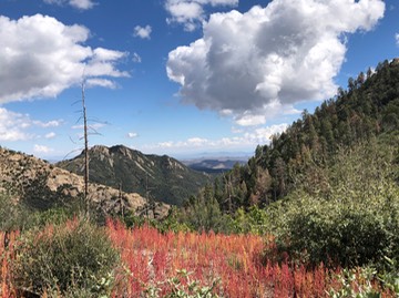 The two top photos are from the east side of the range near Kingston, acknowledging our clear days and the smokey days of our fire season. The bottom photo is from Railroad Canyon on the west side of the Black Range. This year the creek rarely had running water.
